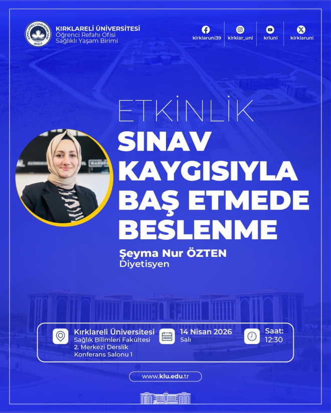Üniversitemiz Öğrenci Refahı Ofisi Sağlıklı Yaşam Birimi tarafından düzenlenen “Sınav Kaygısıyla Baş Etmede Beslenme” başlıklı seminer, 14 Nisan 2026 Salı günü saat 12.30'da 2. Merkezi Derslik SBF Konferans Salonu-1’de gerçekleştirilecektir.